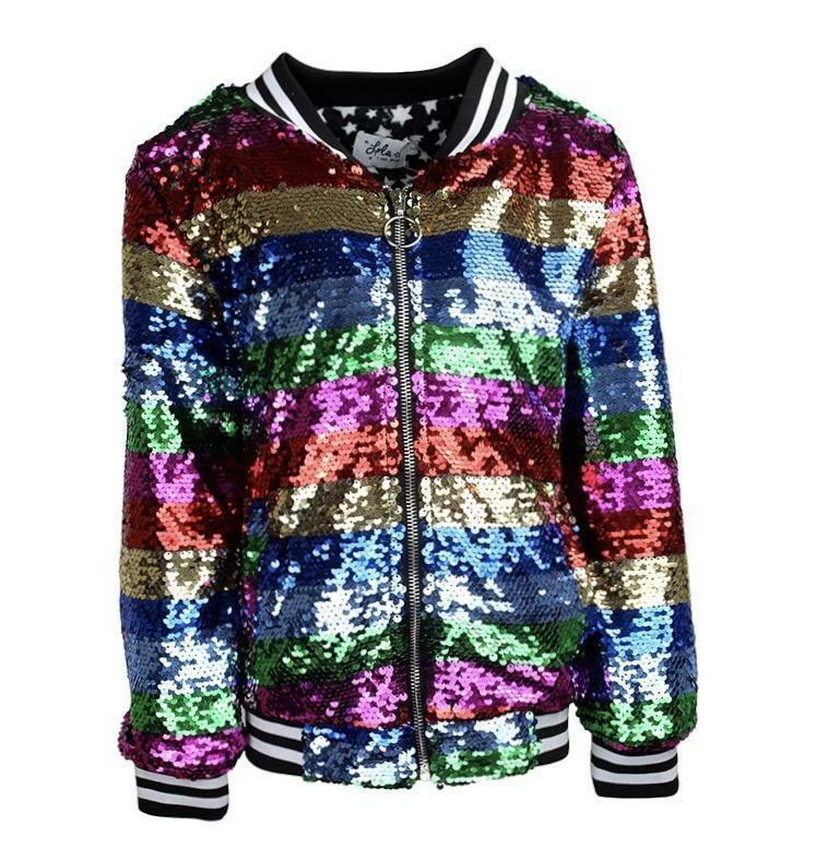 Sequin rainbow bomber with star fleece lining making this the perfect jacket to layer for any occasion Allow 2-3 weeks to ship