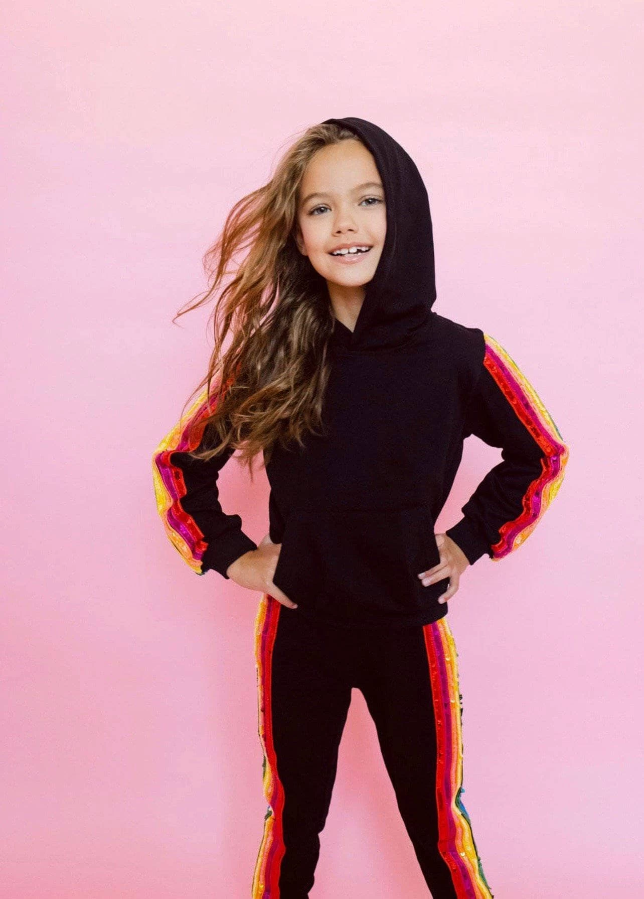 Super soft hoodie with embellished sequin rainbow sleeves and pant legs. Â